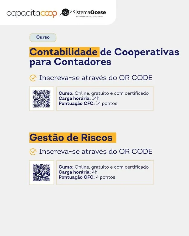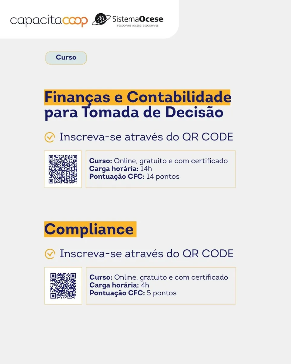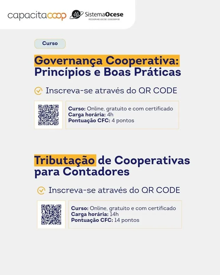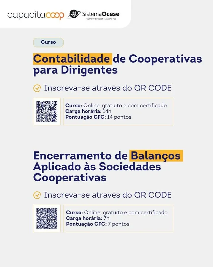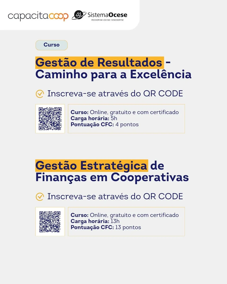 Aqui no Sistema OCESE, reunimos 10 cursos gratuitos, reconhecidos pelo CFC/CRC, disponíveis na CapacitaCoop — plataforma gratuita de ensino a distância do Sistema OCB, entidade nacional do cooperativismo